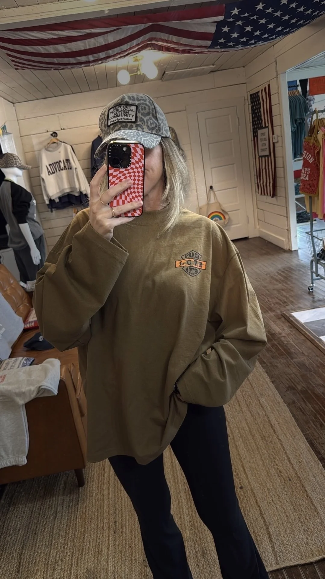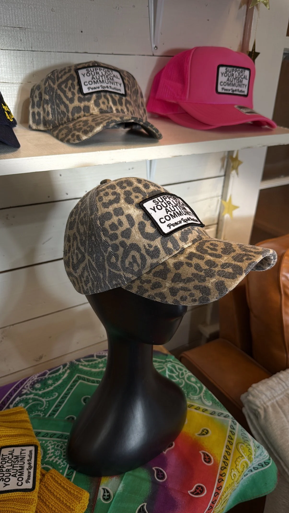 weathered leopard print baseball hat with sewn on “Support Your Local Autism Community” PLA patch.