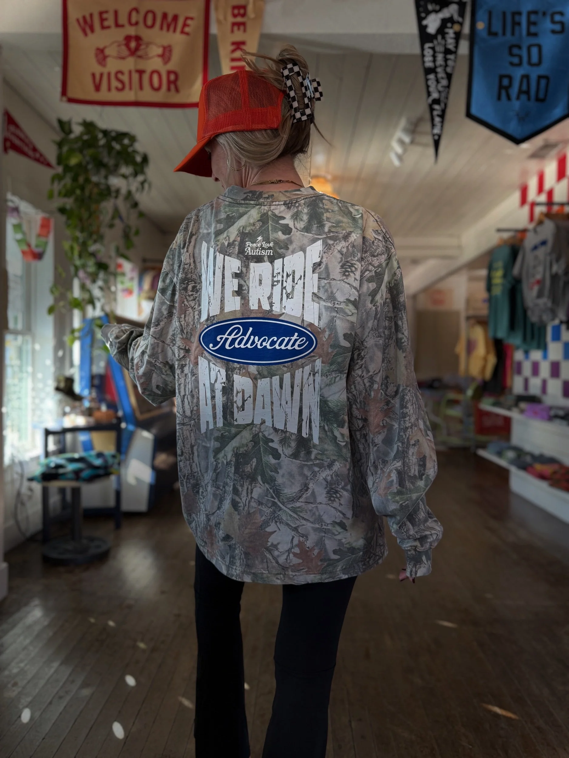 Oversized boxy long sleeve with “advocate, we ride at dawn” design.