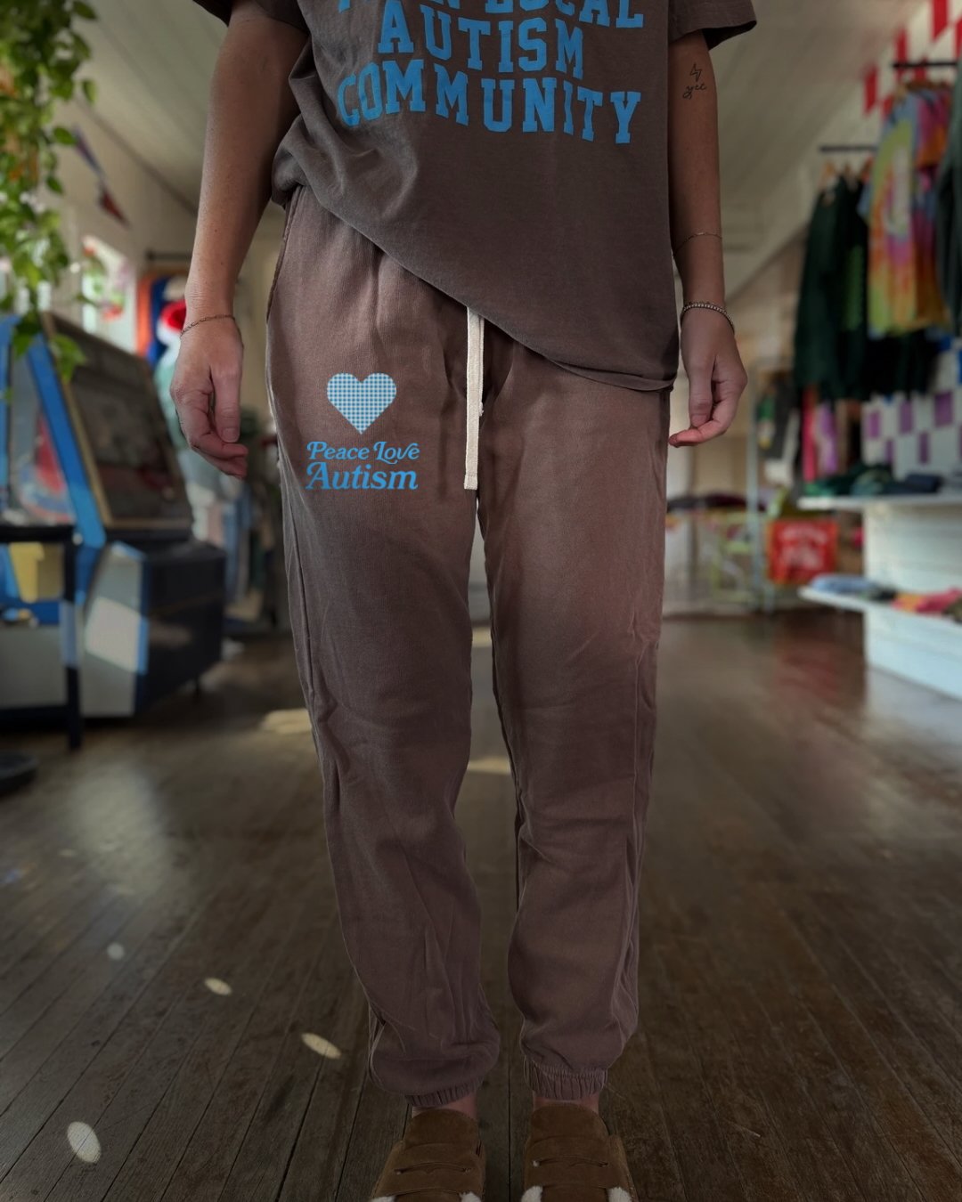 Sport grey open bottom pants that pair with the Cambridge Tee. Maroon ink on the left leg, “Peace Love Autism”.