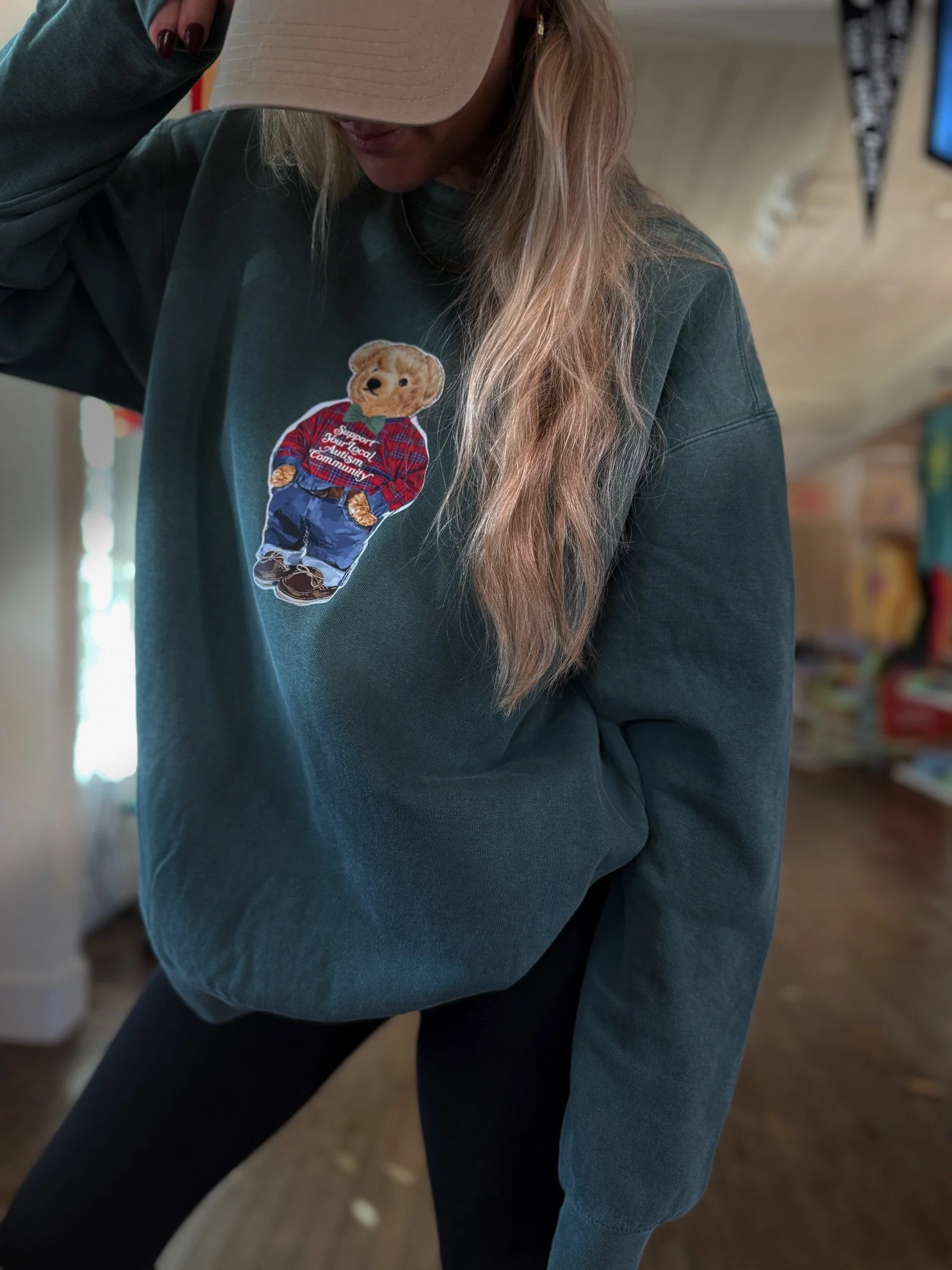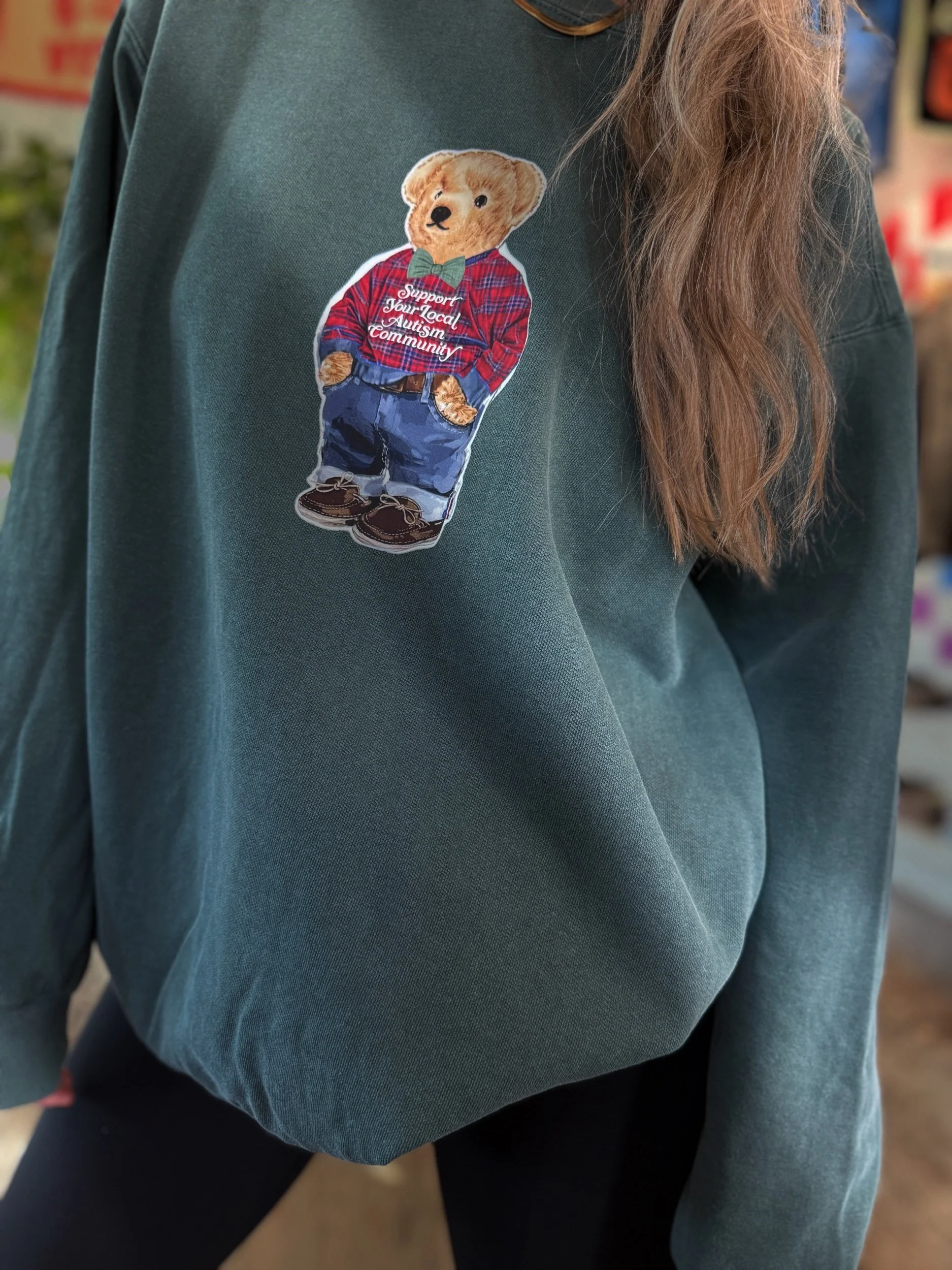 Unisex Comfort Colors dark green sweatshirt with Christmas Bear “support your local autism community” art on front and logo on the back.