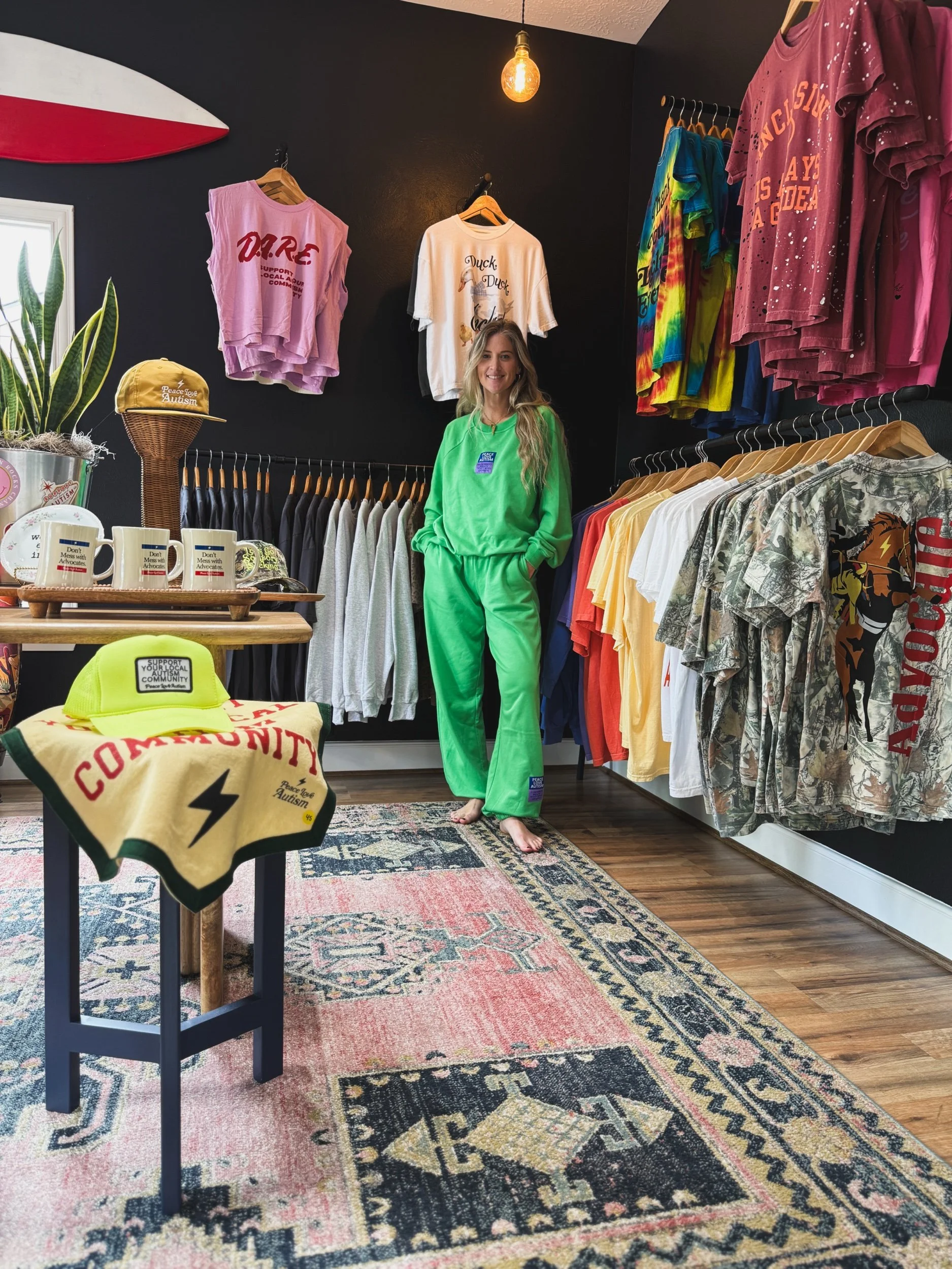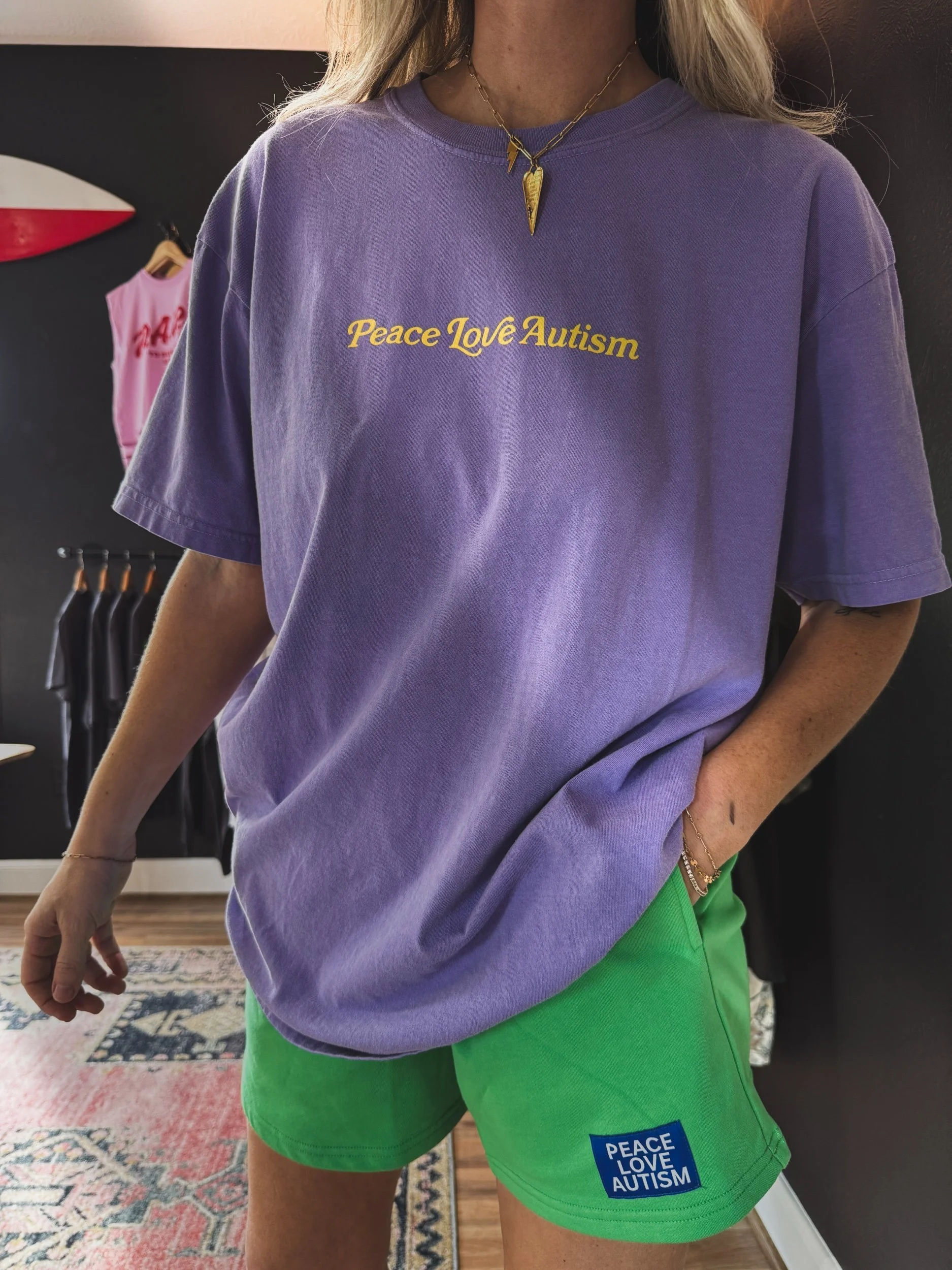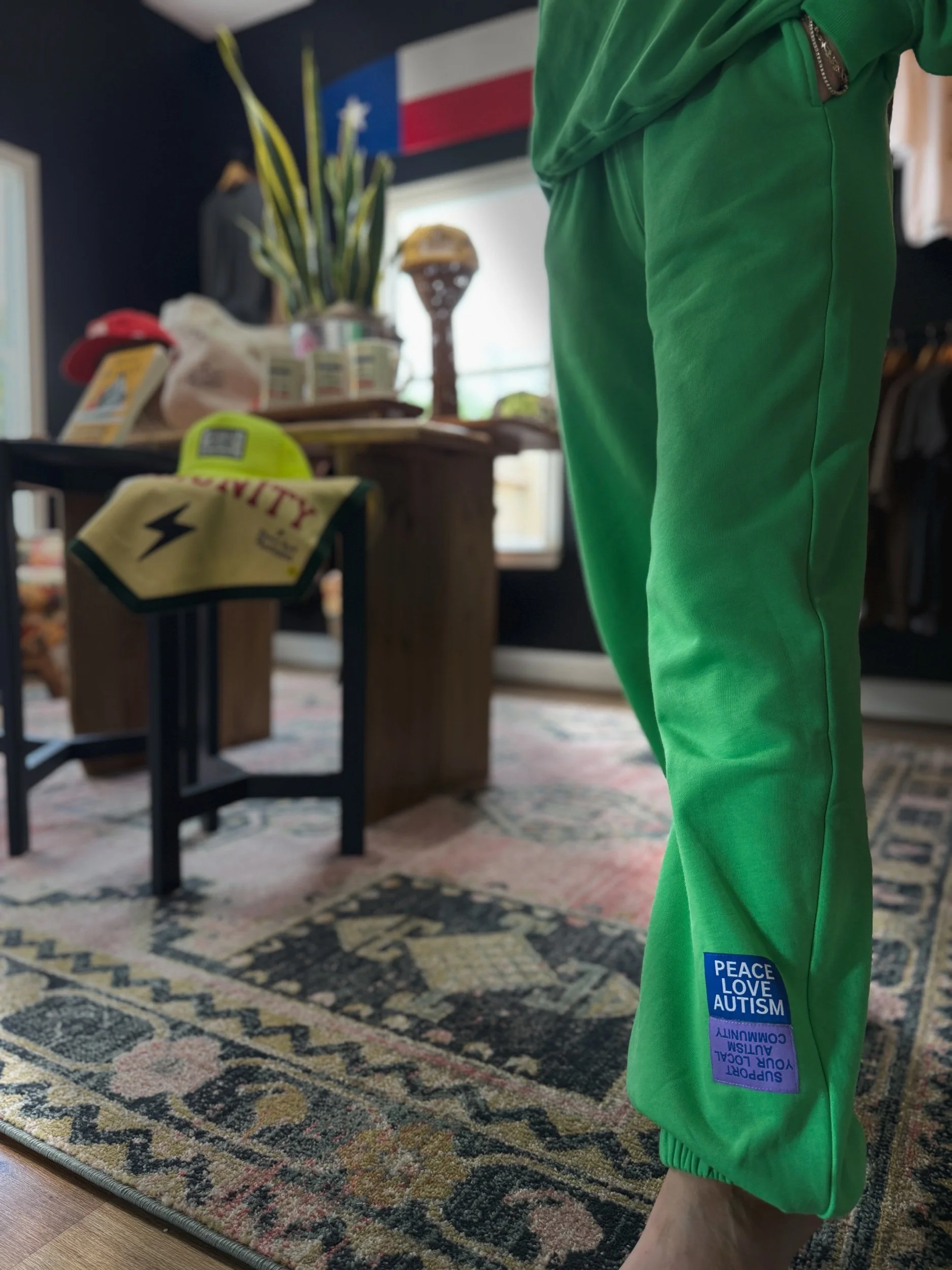 Our cozy custom green shorts with our blue logo patch. Matches the Lime + Violet Sweatshirt and Pants.