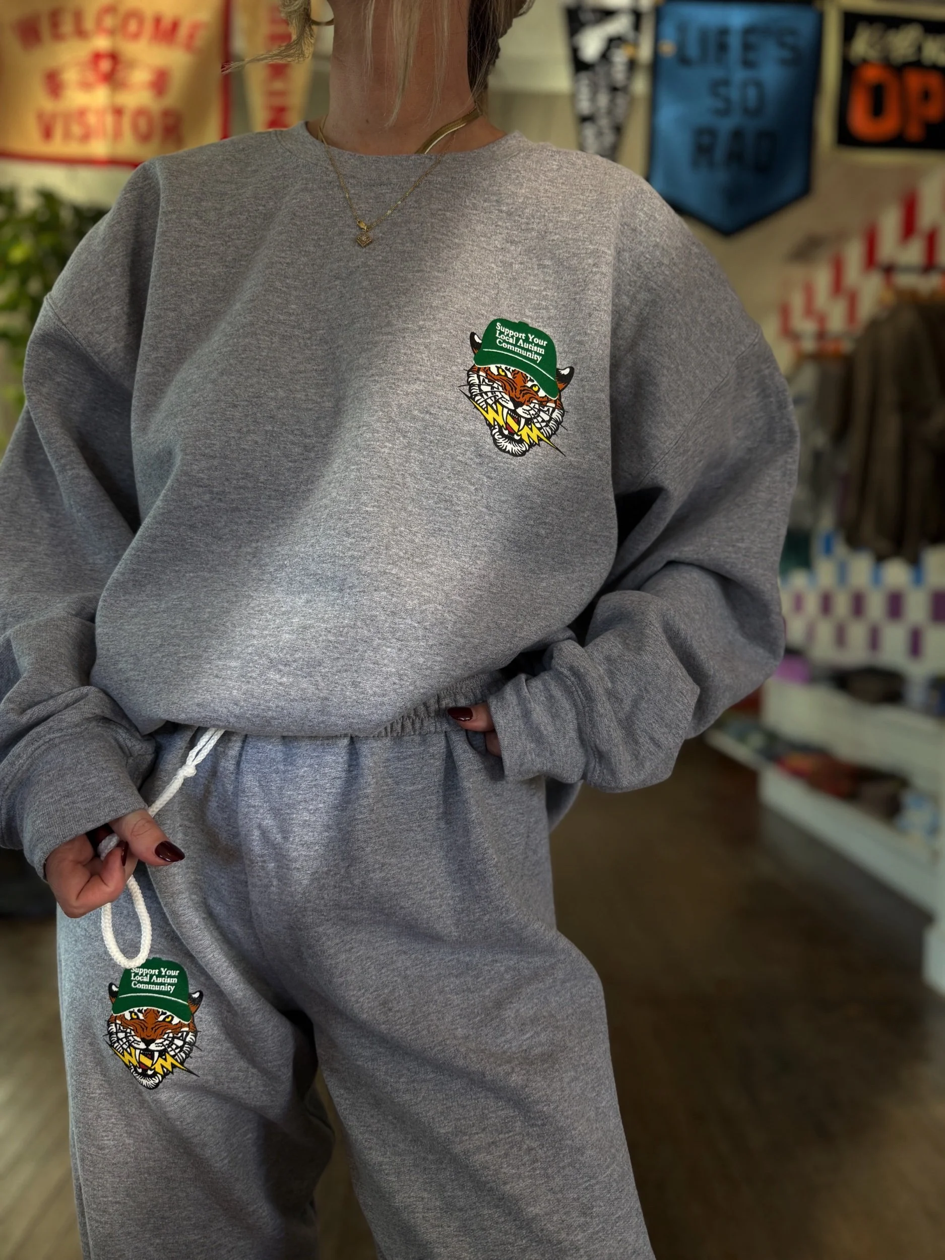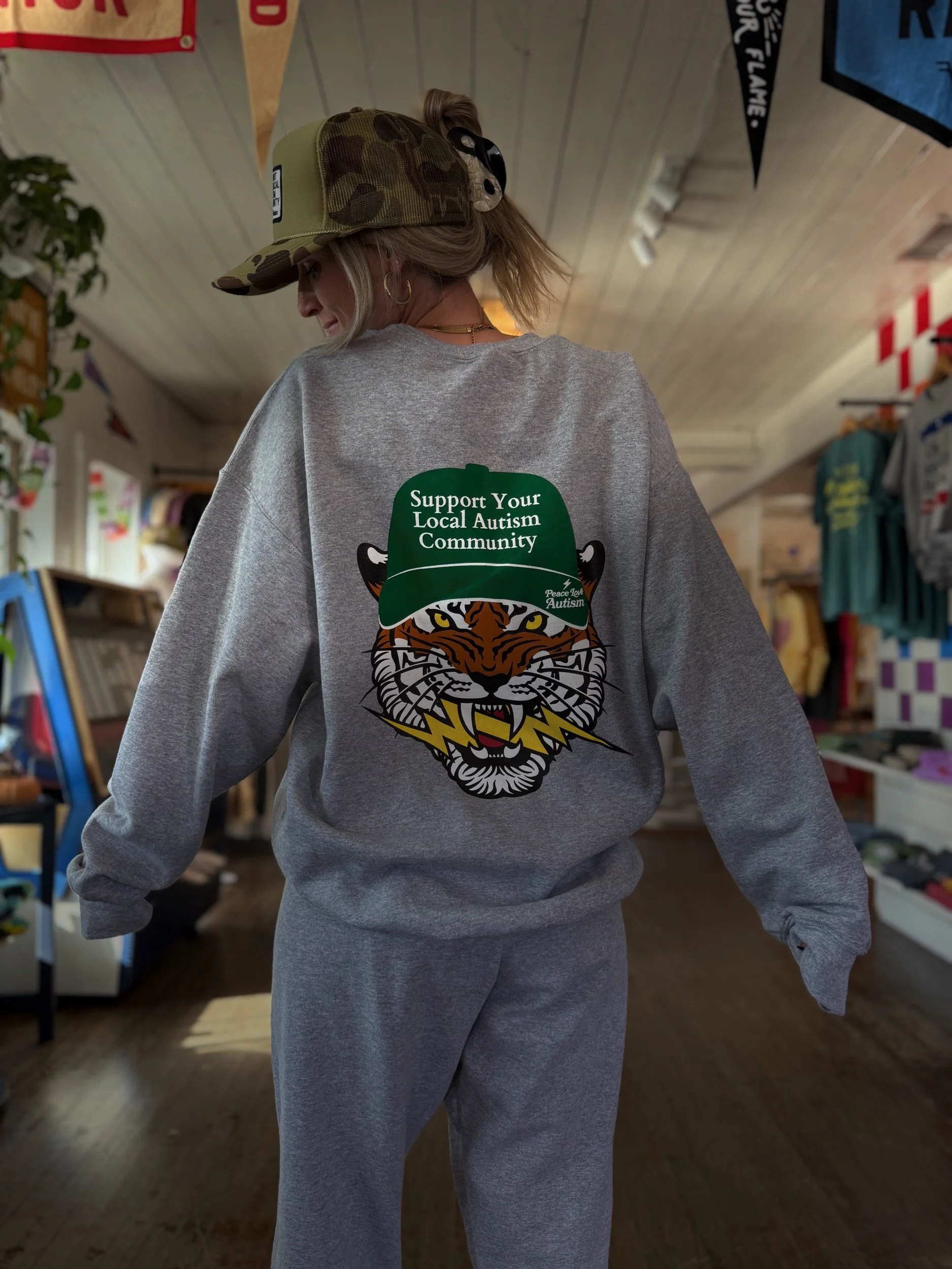 Lightweight, unisex grey sweatshirt with Tiger “support your local autism community” design on front and back. Matching sweatpants here.