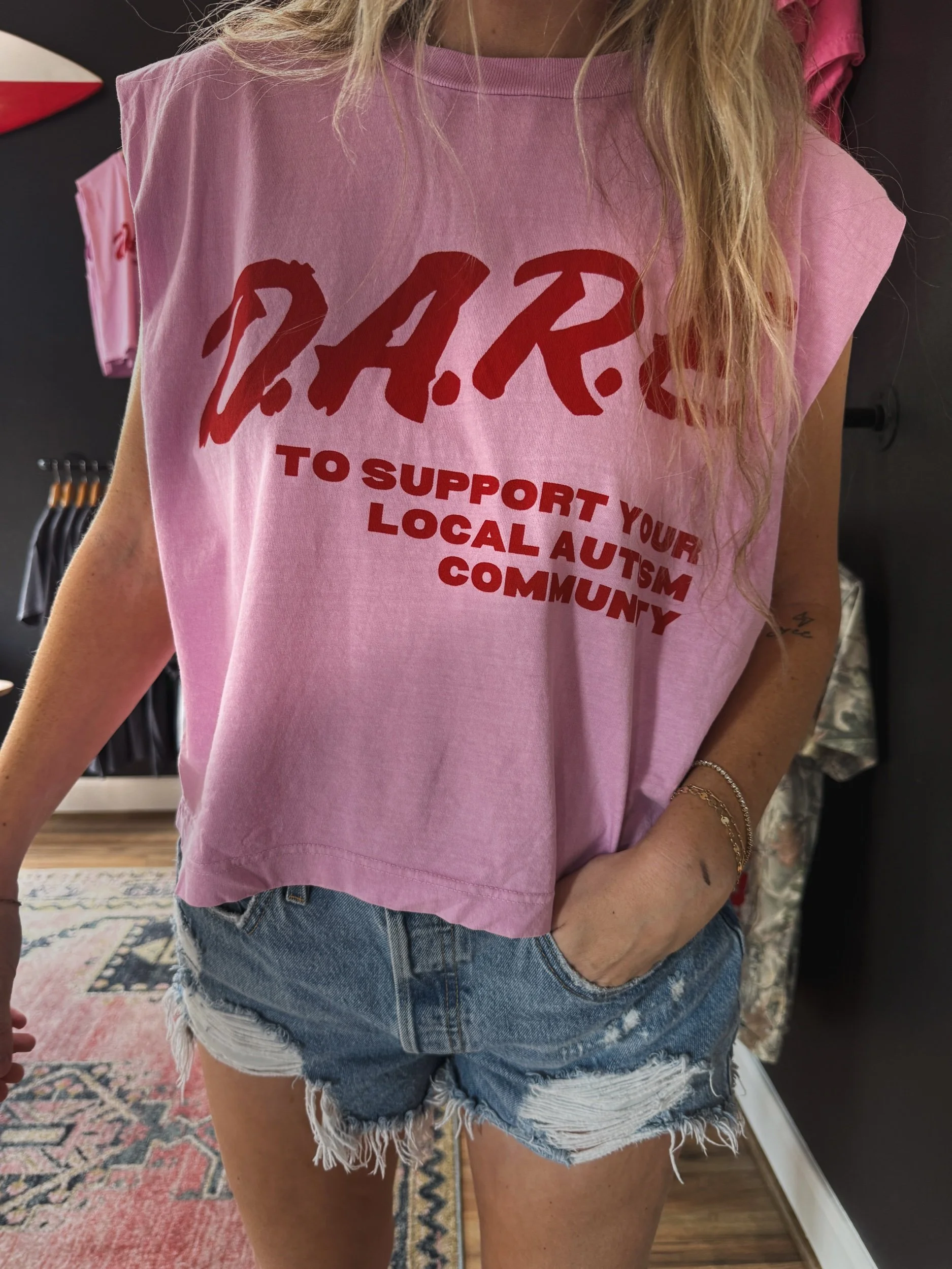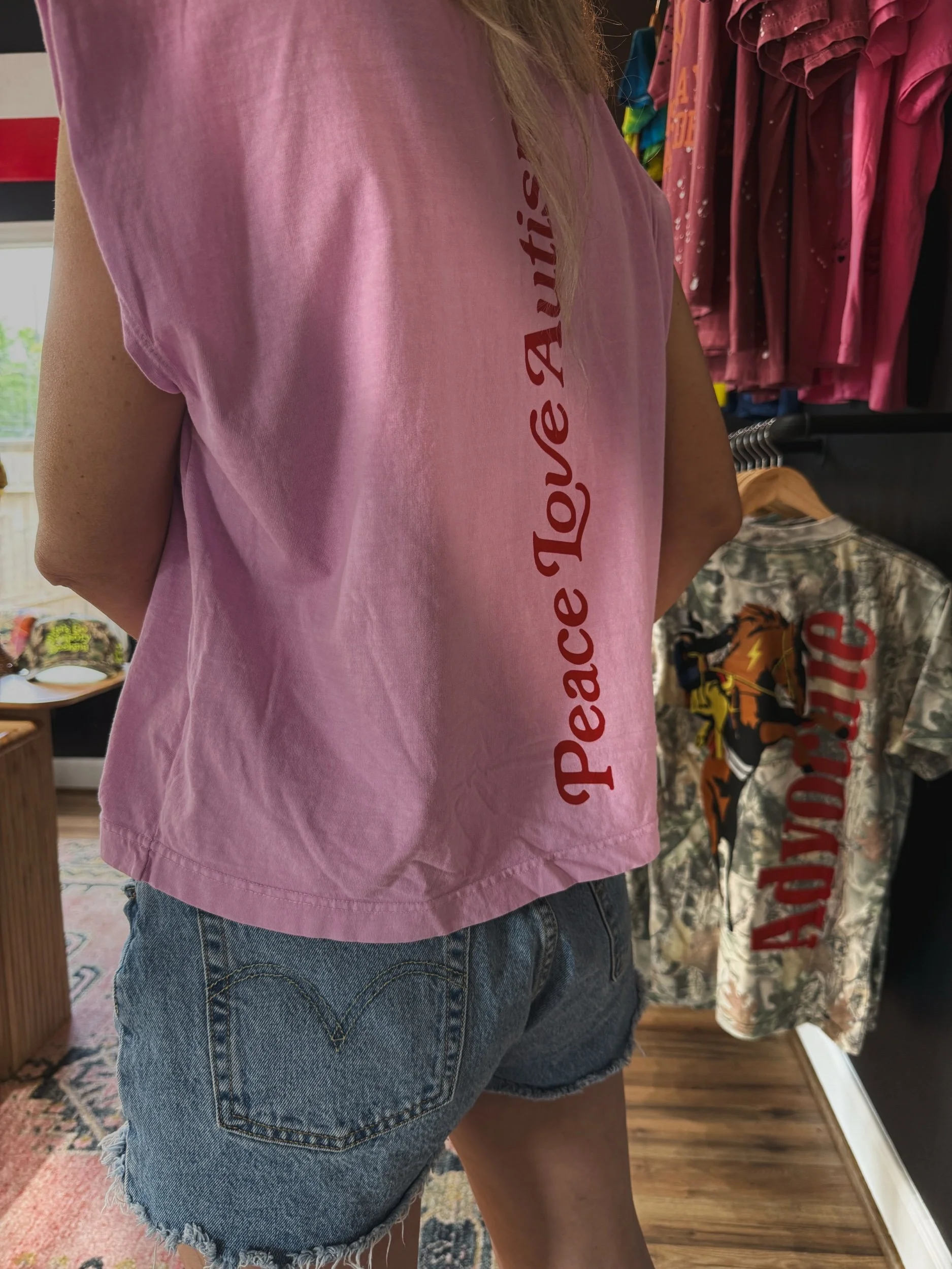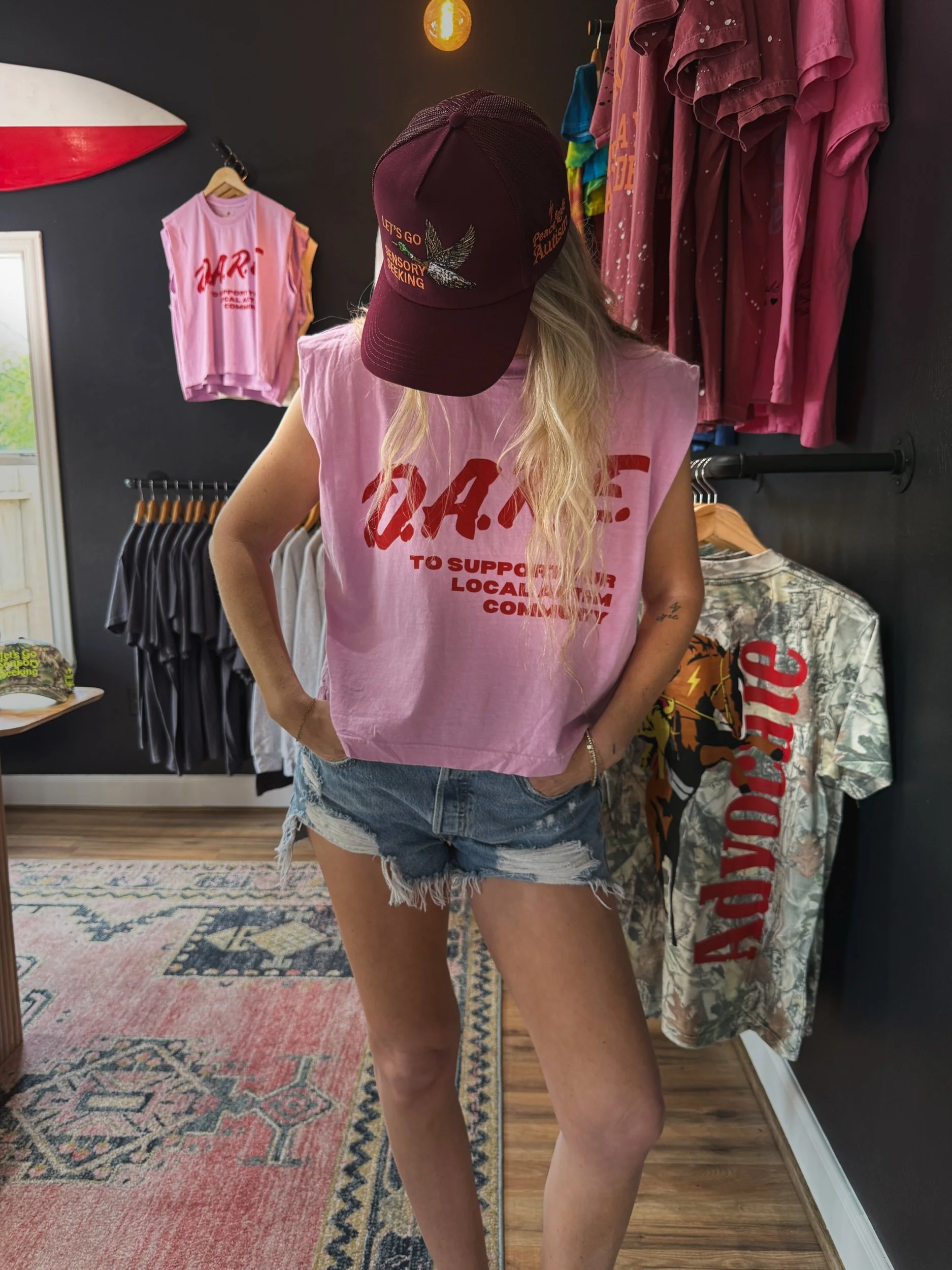 An edgier tank top option and my current favorite in the shop. Pink tank with red ink screen printed front and back.