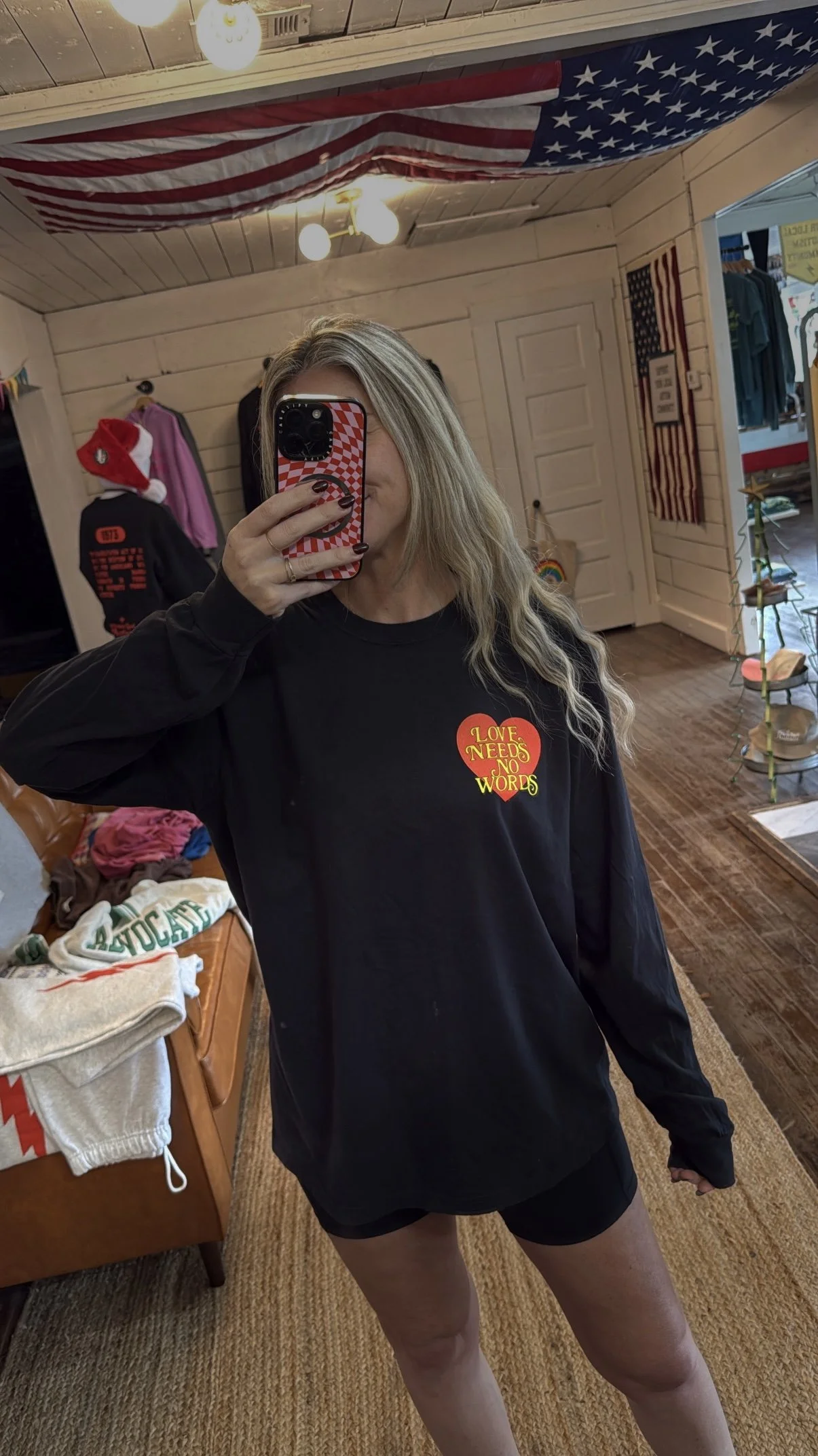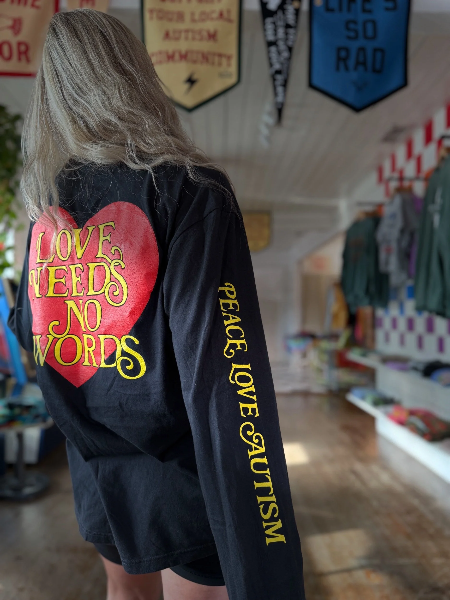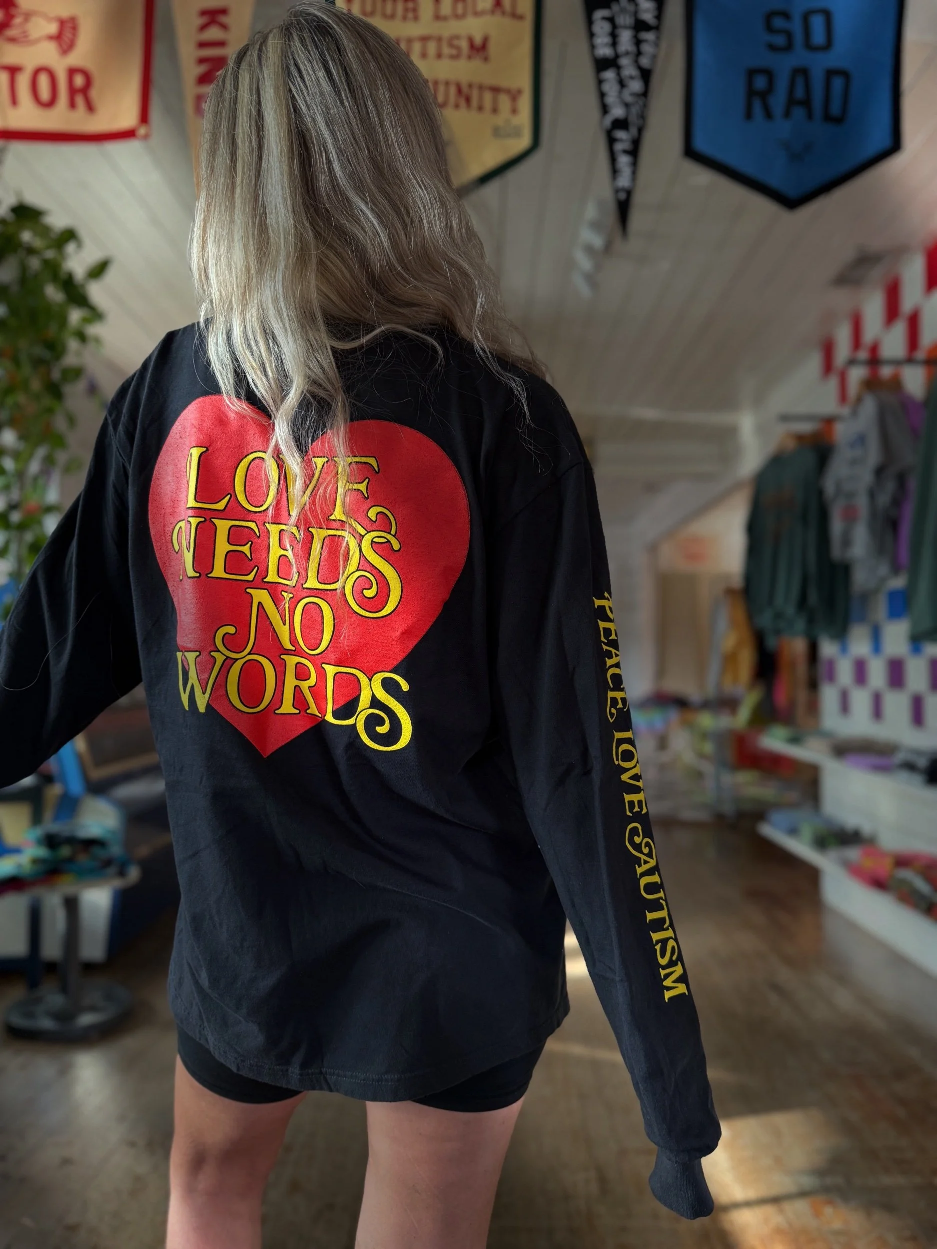 black long sleeve unisex tee with the “love needs no words” design. red and yellow ink. Size up for an oversized look.