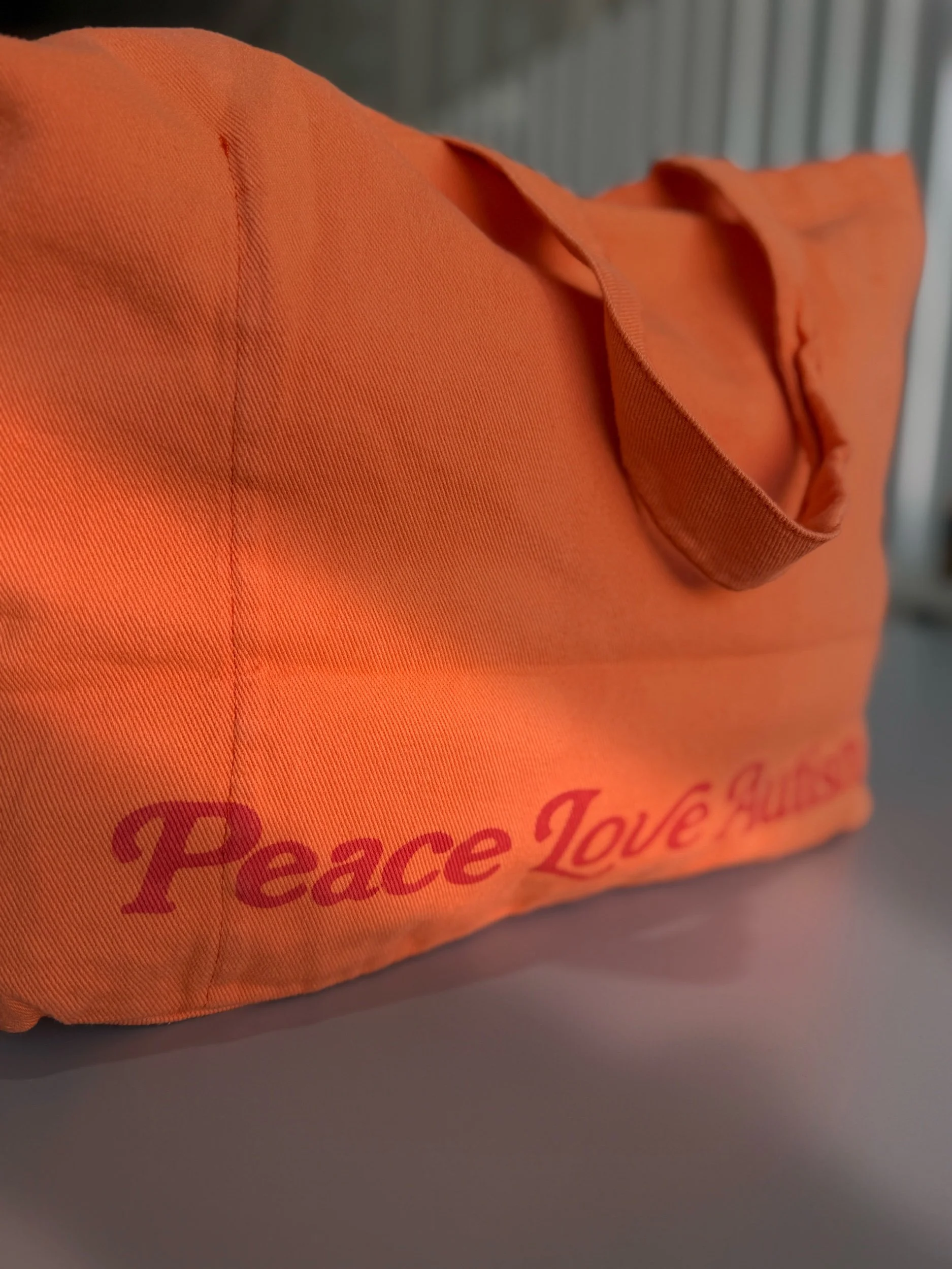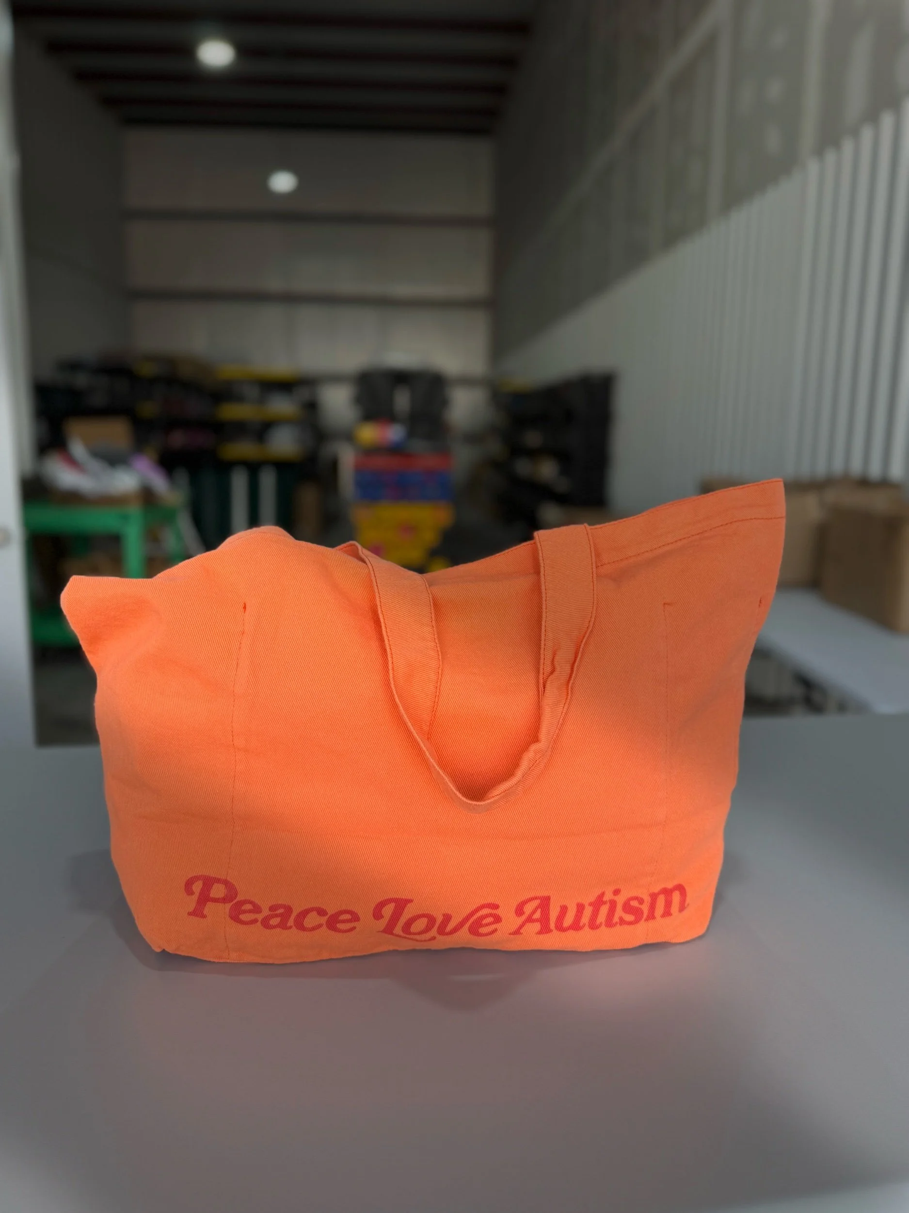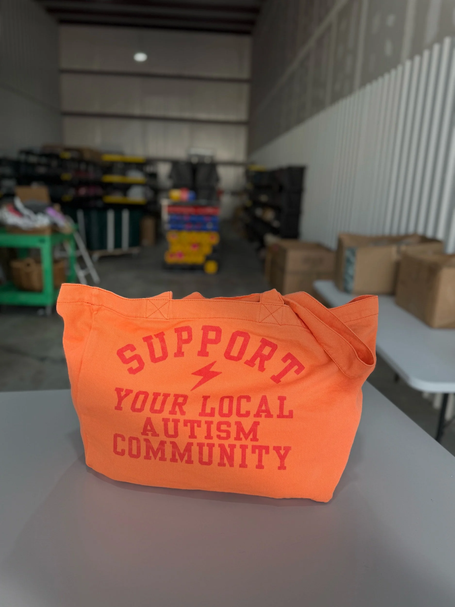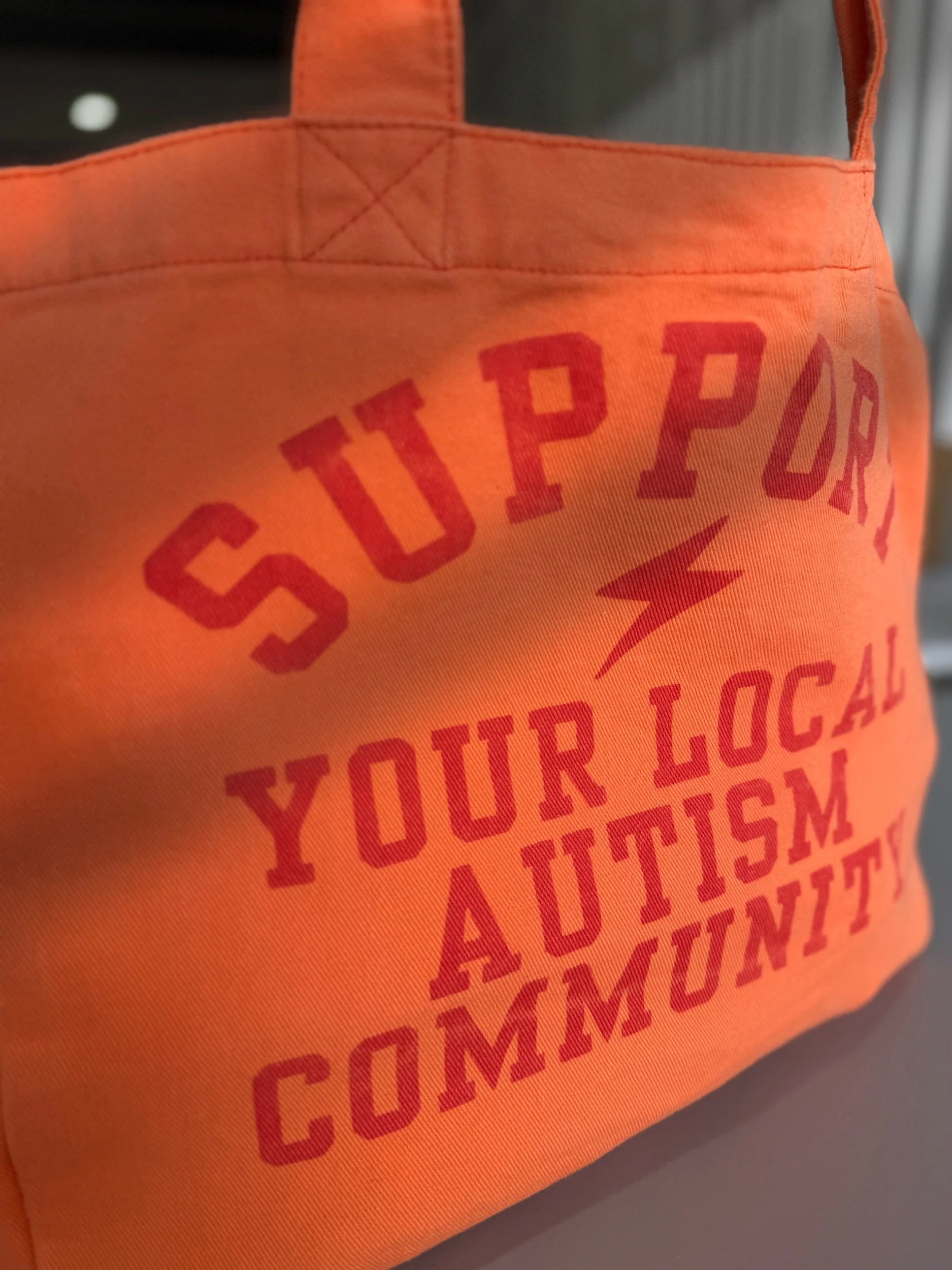 Neon orange jumbo tote with two inner pockets (one for a tumbler) and a screen printed design with our ‘support your local autism community’ message in red ink.