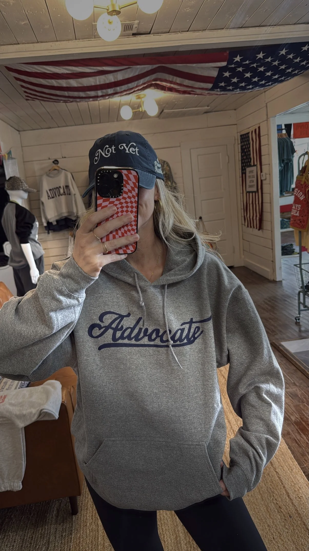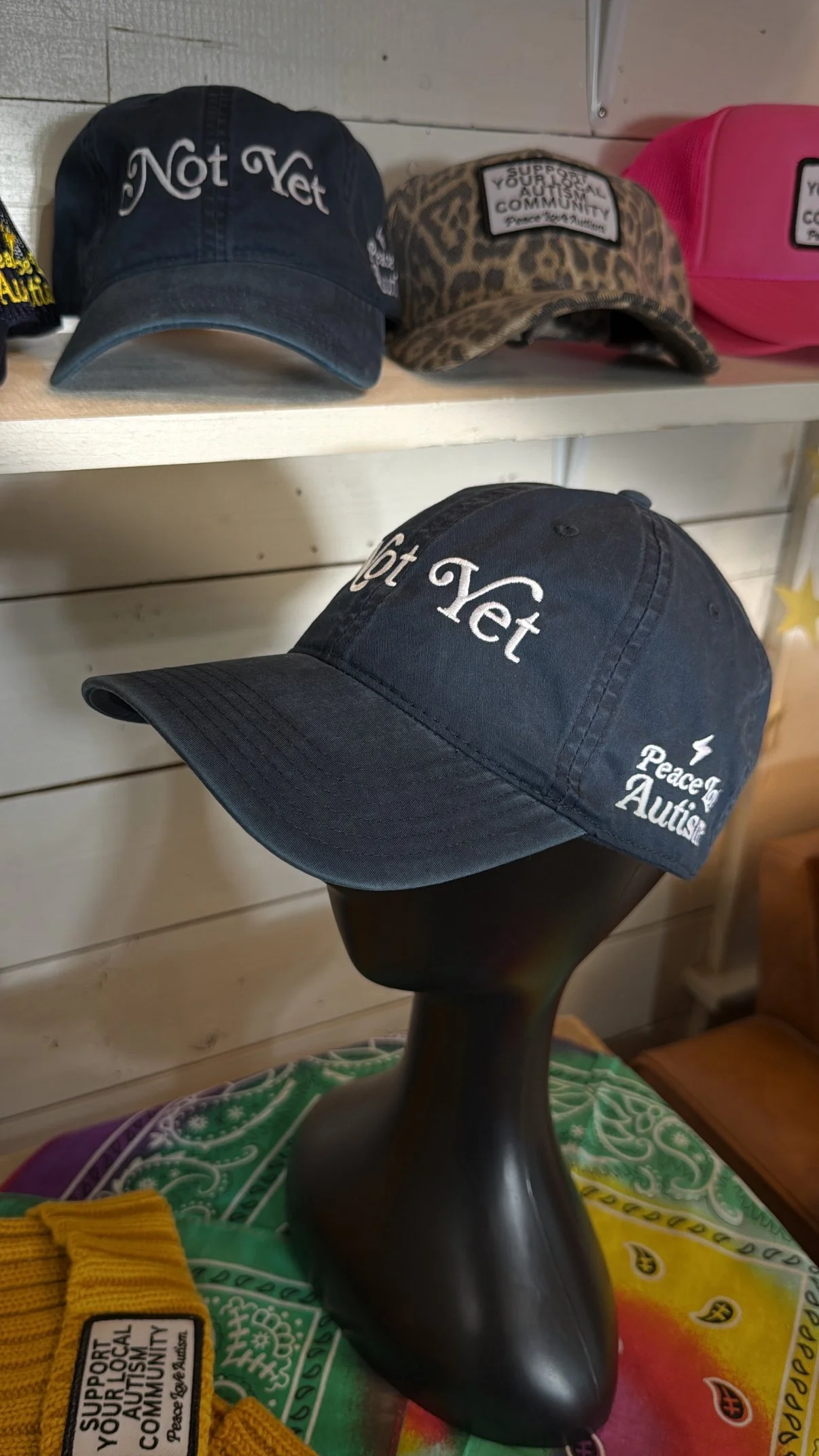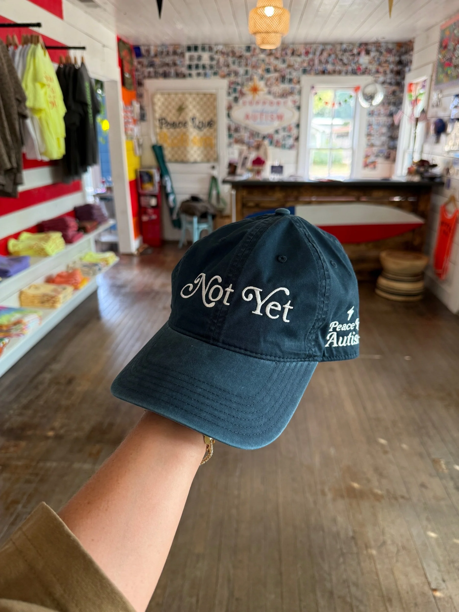Vintage navy dad hat with white embroidered “not yet” message and logo on the side.