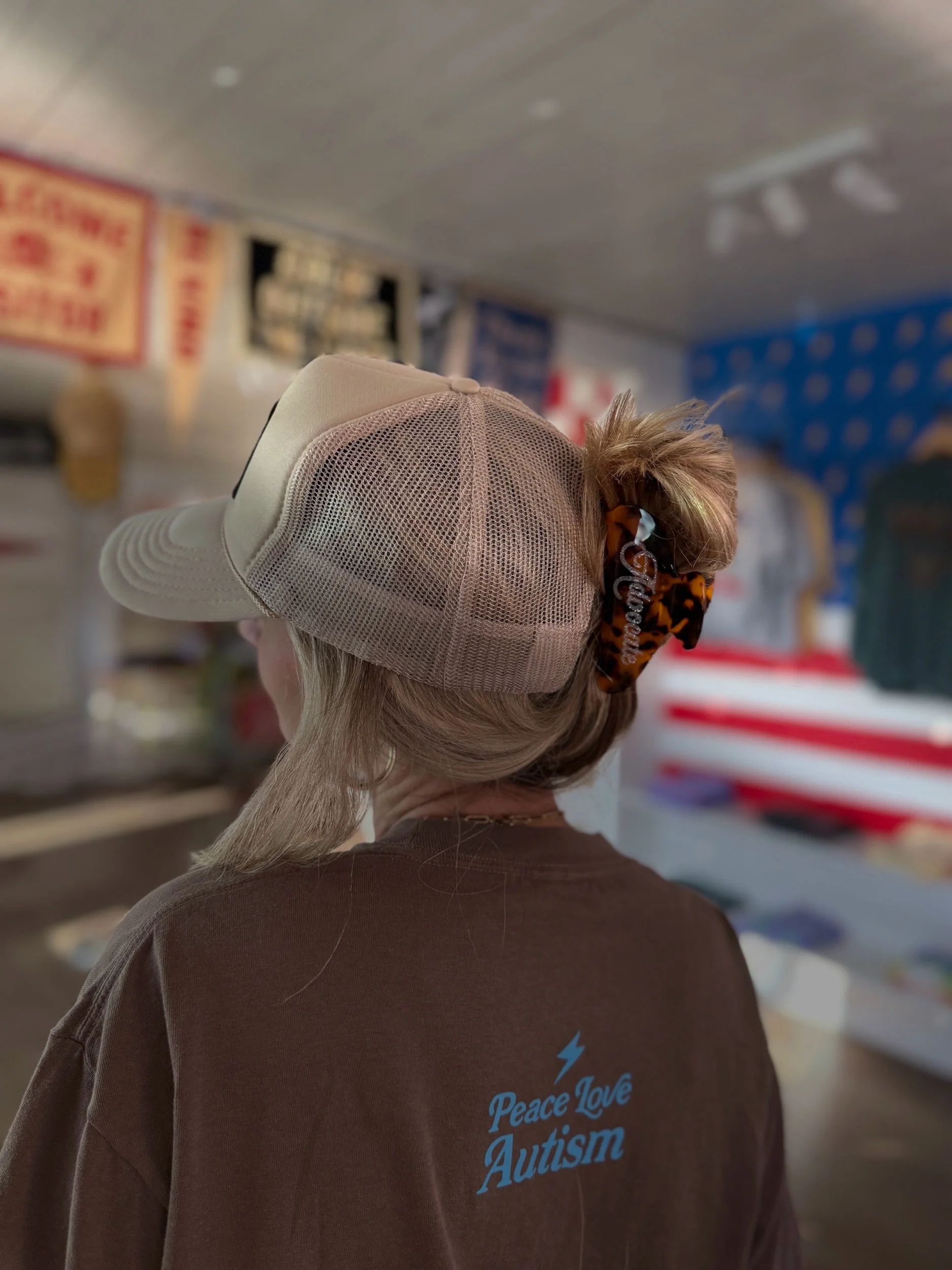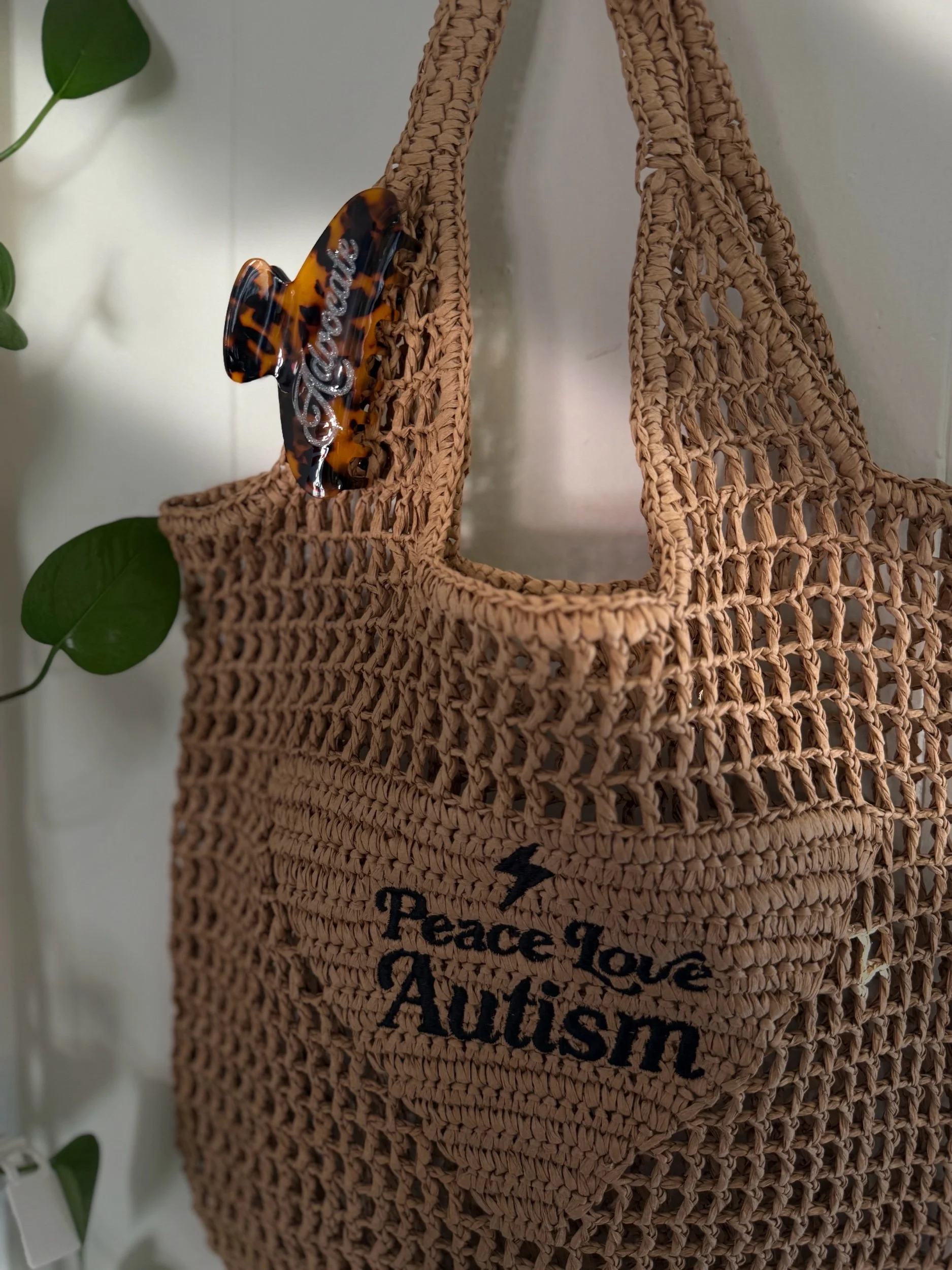 Our first claw clip of many more to come! Tortoise shell clip with glitter ink spelling out ‘advocate’ on both sides.