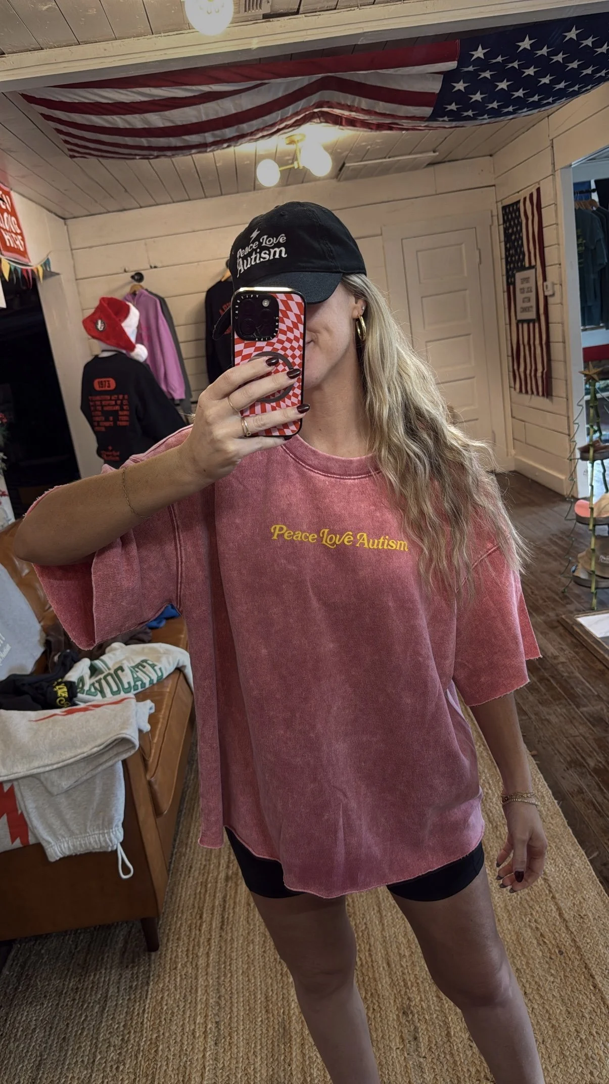 mineral washed oversized pink french terry tee with yellow puff ink logo on front.