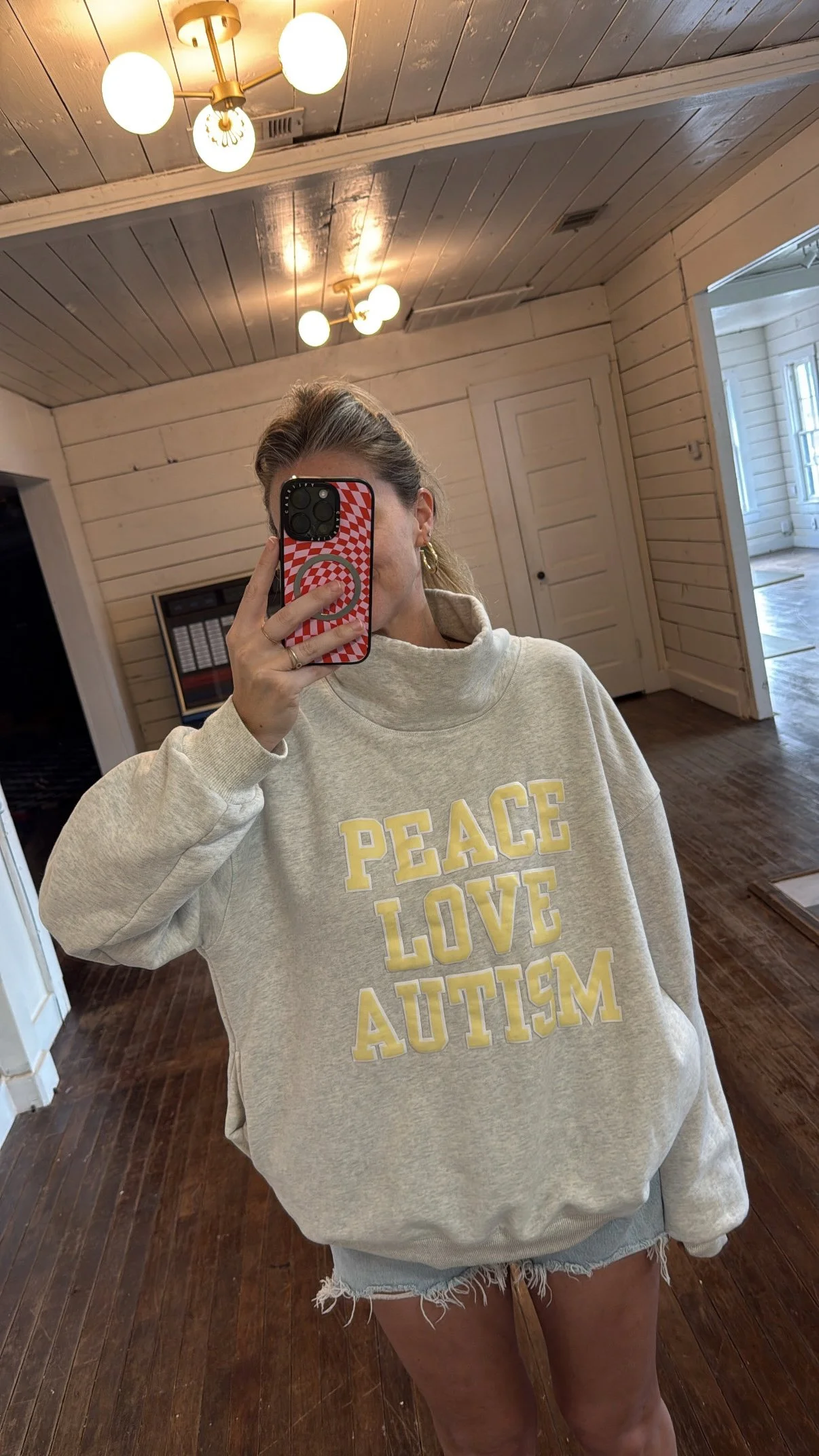 IT HAS POCKETS! This oatmeal grey roll neck sweatshirt has two side pockets and a puff print in butter yellow and white on the front. Roll the neck down or keep it up, whichever you prefer!