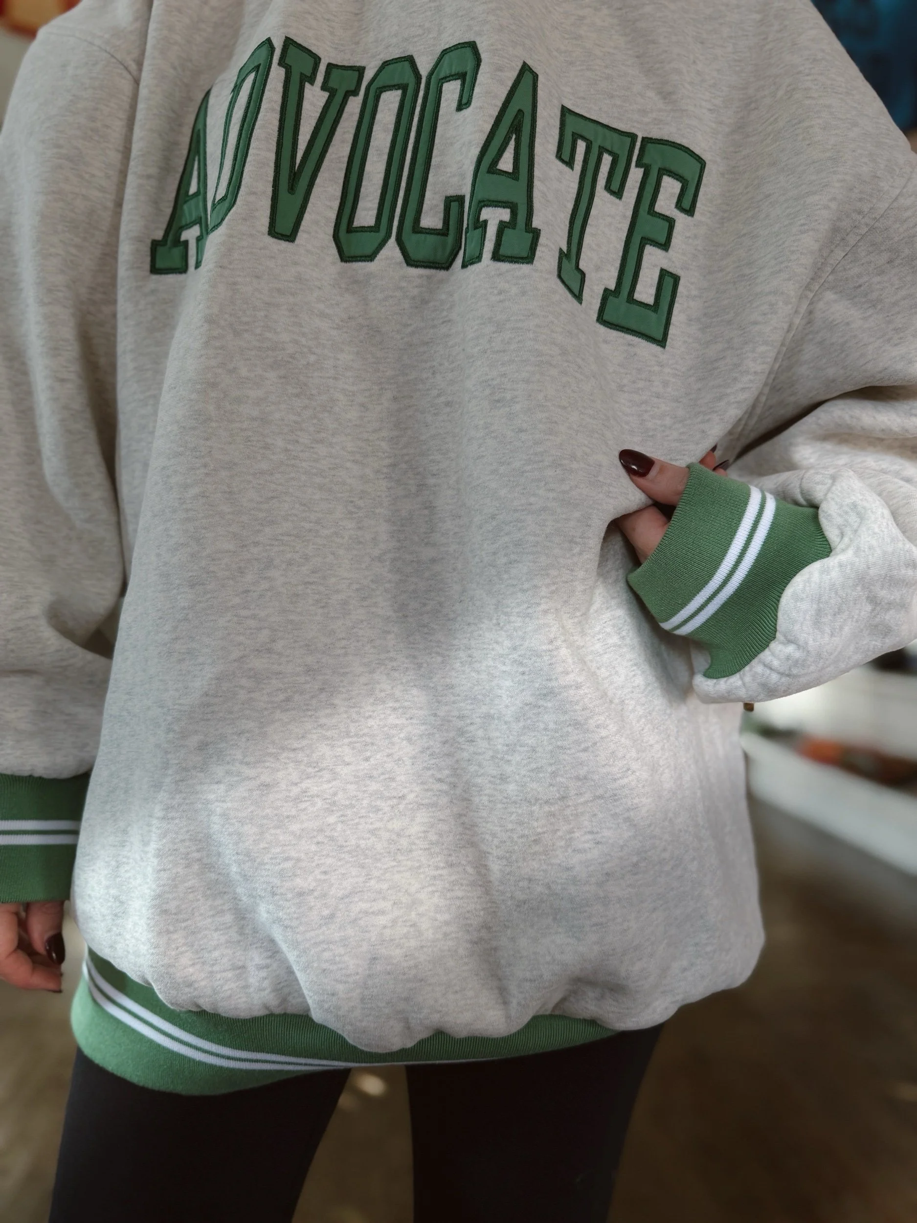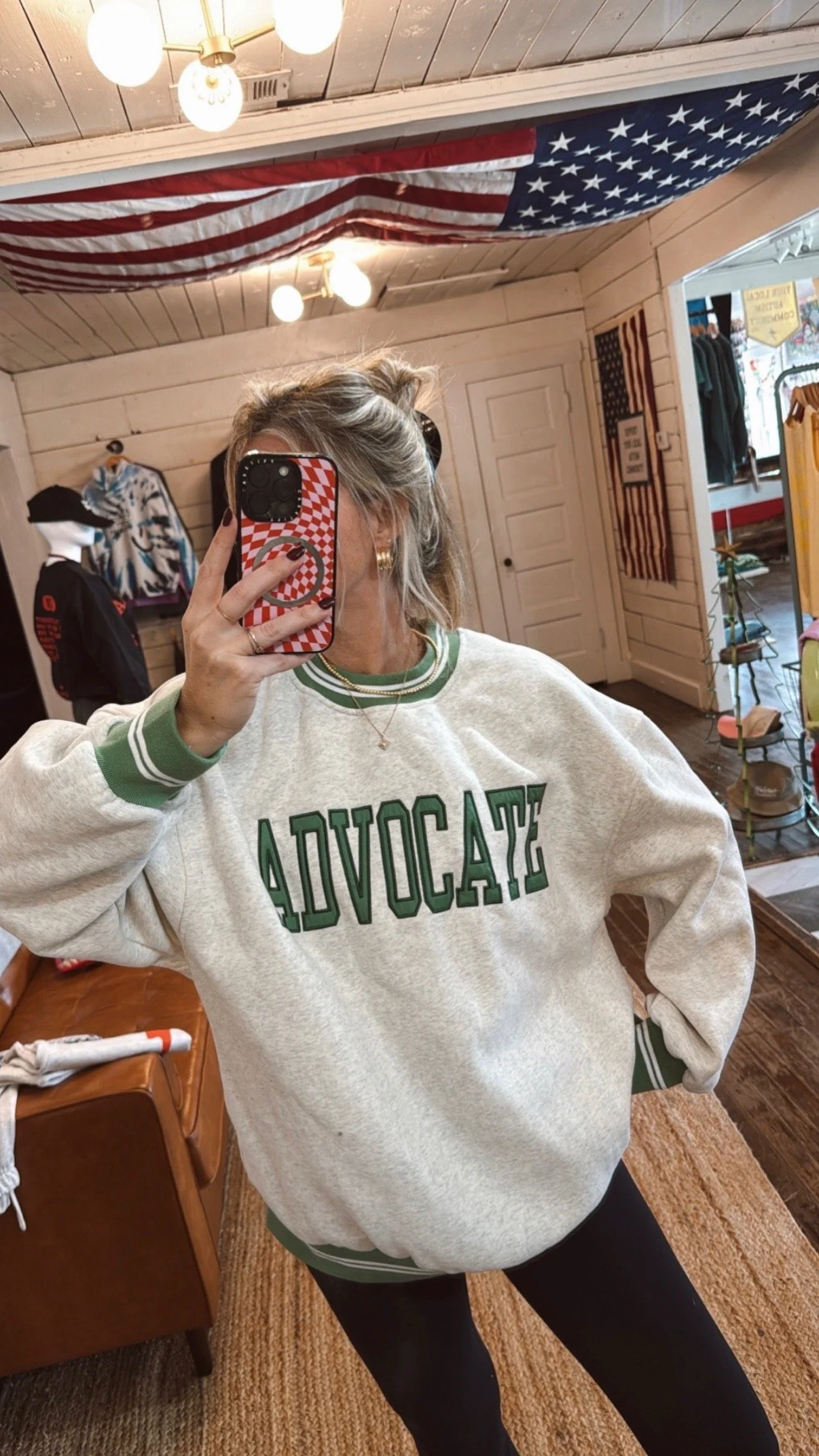 “Advocate” patch embroidered crewneck with embroidered logo on the back. So incredibly cozy and slightly oversized.
