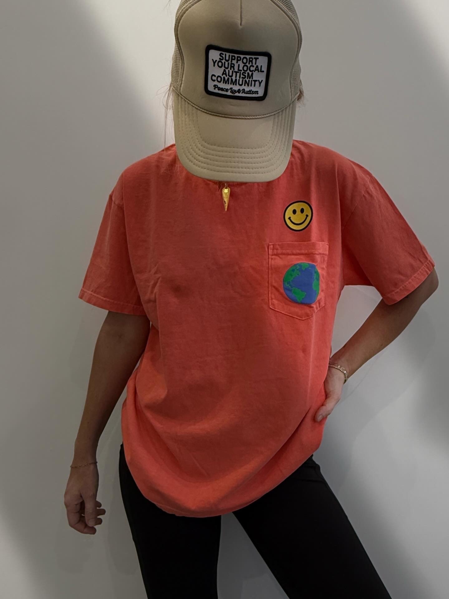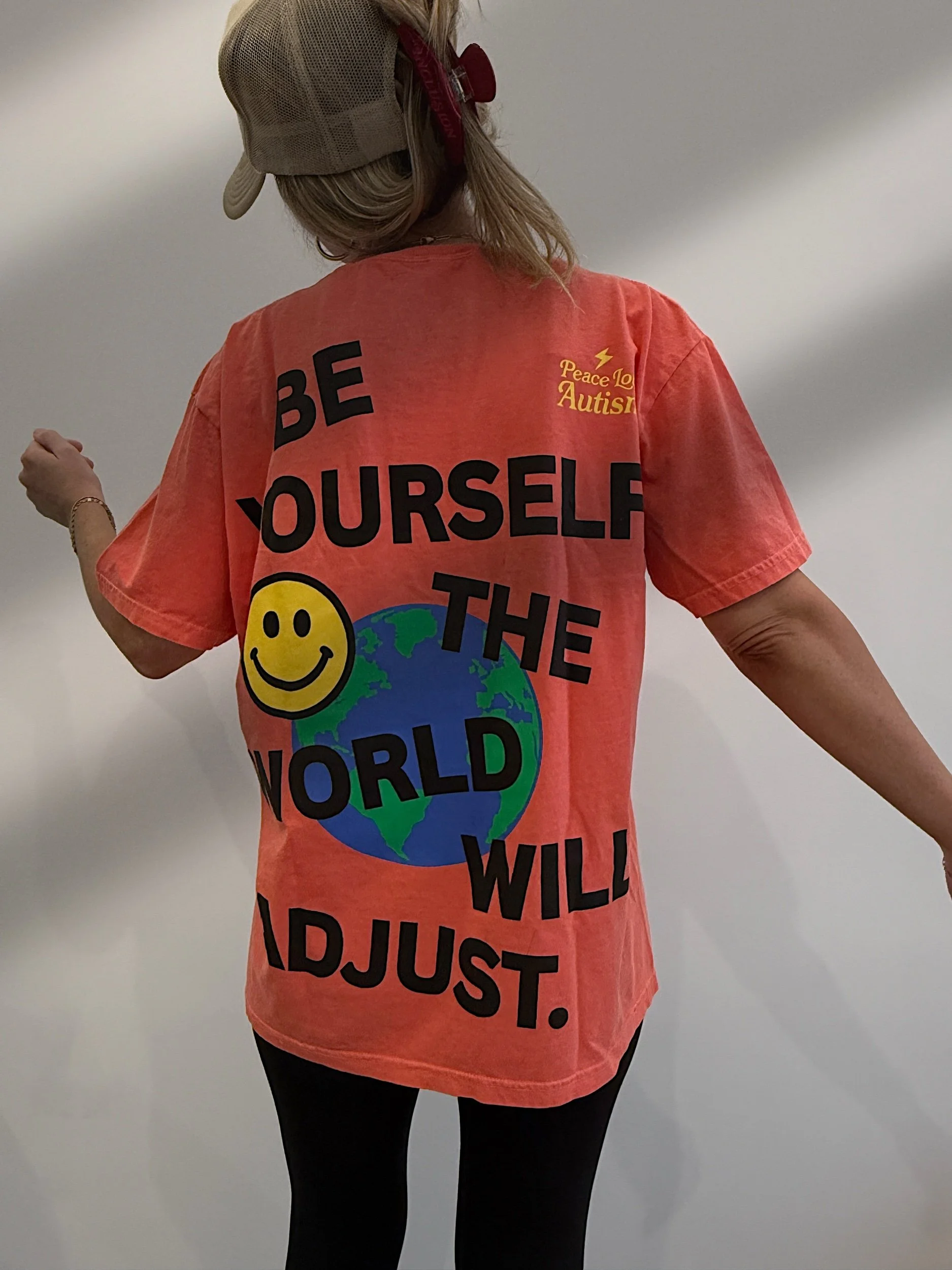 Be yourself, the world will adjust! Bright orange pocket tee with screen printed design.